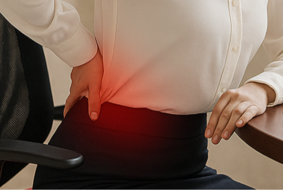 Most people unknowingly sit in a posterior pelvic tilt - meaning the pelvis rolls backward, flattening the natural curve of the lower spine. This creates a chain reaction: lumbar compression, slouched shoulders, forward head posture, and strain on the neck and upper back.